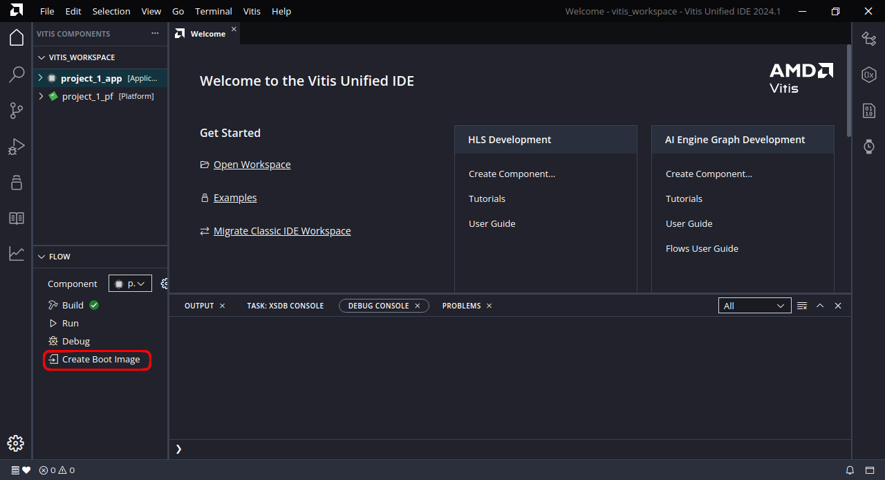 Open the project's Workspace in the Vitis Unified IDE and click on "Vitis Components: Flow: Application Component: Create Boot Image".